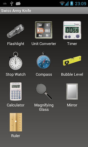 : T contains a set tools: a flashlight, a un, a timer, a stop watch, a compass a bubble level, a calculator, a magnifying glass (Android 2.2+ required), a mirror (Android 2.3+ and front camera required) ruler.
