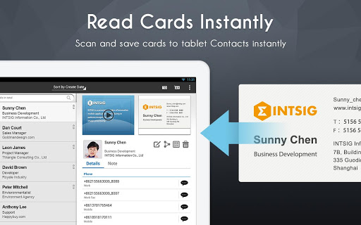 CamCard reads business cards instantly Contacts. all across smartphones, tablets, computers web app.